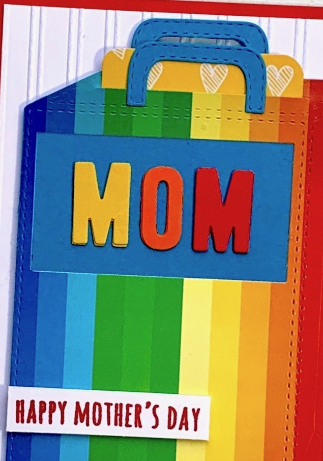 Assembling this card was a cinch. After I die cut the gift bag and its handles from card stock, I die cut an opening in the bag with the “Cross Stitched Rectangle” die and inlaid “MOM” (tripled layered for greater dimension) inside the rectangular opening.