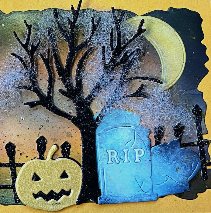 - Die cut the spooky tree, pumpkin, headstones, fence, bat, and moon (ALL included in the collection!) and adhered them to the front of the card to create a cemetery scene.
